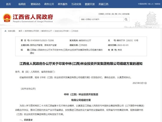为推动江西现代林业产业示范省建设,加快推进江西由林业大省向林业强省转变,近日,江西省人民政府办公厅印发了《中林(江西)林业投资开发集团有限公司组建方案》。
