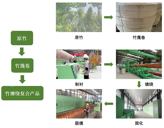 原竹经过加工形成竹篾卷,后经过“制衬-缠绕-固化-脱模”一系列工序就可以制作成竹缠绕复合产品。