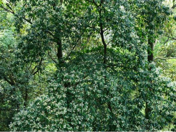 花期在4-8月,不同地区略有差异,南方温暖的地方花期4-5月,稍冷的地方要等到6-8月。花不算大,但胜在数量多,满树黄白色的小花热热闹闹地开着,放眼望去也好似一片白色海洋。果实10-12月成熟,由青绿慢慢变成暗紫色,熟透后会自然脱落。